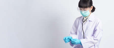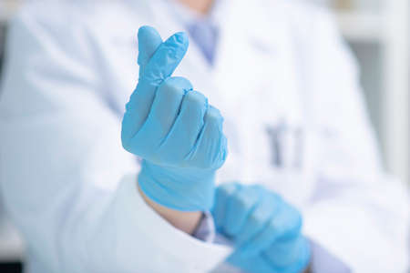 Wearing gloves. Asian doctor wear blue rubber nitrile hands glove. Doc with a mask putting on gloves. isolated white background copy space. Health care protection coronovirus pandemic concept.