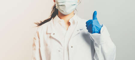 Covid19, coronavirus, healthcare.CloseupUnrecognizable young doctor in medical coat wearing mask amd gloves against gray background