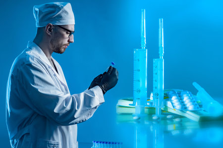 Doctor drug testing. Pills and syringes next to doctor. Medic on a blue background. Concept - drug testing in laboratory. Loborant examines test tube with a vaccine. Vaccine testing. Drug production