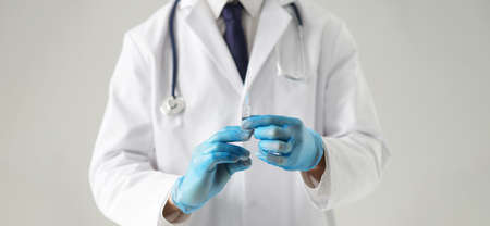A doctor in a medical gown and blue gloves with a stethoscope in his hands in a hospital on a white background. selective focus. close-up
