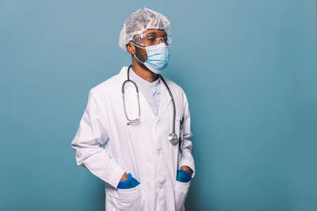 Doctor Man on blur hospital laboratory panoramic blue background. COVID-19 virus epidemic outbreak to Coronavirus pandemic disease global recession wide concept for social scientist vaccine