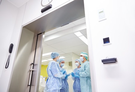 surgery, medicine and people concept - group of surgeons in operating room at hospital talking and preparing to operation