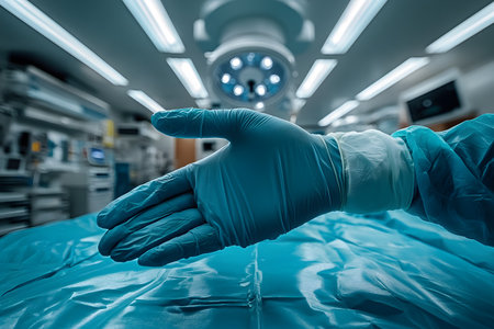 Surgeon s gloved hand gesturing over an operating table in a sterile, well-lit surgical environment. focus on precise tools, clean surroundings, and advanced medical facilities signifying healthcare excellence. Generative AI