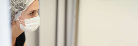 Woman puts on a protective mask and suit. Protected against flu, ebola, tuberculosis, virus. Personal protective equipment against biological hazard.
