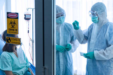 COVID-19, Corona Virus outbreak quarantine epidemic spread and social distancing concept. Asian doctors wear PPE monitor patient health and consult CORONA or COVID-19 patient infection treatment