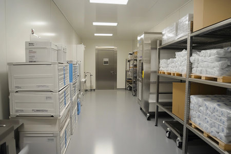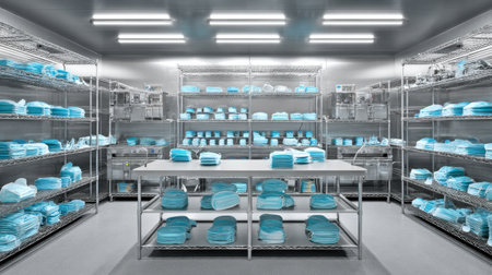 Bright and sterile environment highlights the organized layout of medical supplies. Shelves line the walls, filled with neatly packed equipment ready for use in healthcare settings.