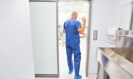 Surgeon after washing hands for disinfection enters the clinic's operating room