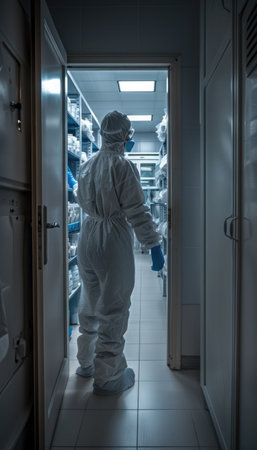 A surgeon or clinician in protective clothing leaves the operating room or intensive care unit exhausted
