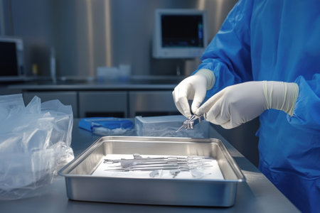 A clinical setup showcasing precision medical tools and instruments arranged on a metal tray with blue gloves, symbolizing preparedness for surgical or dental procedures in a sterile environment.