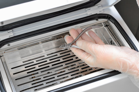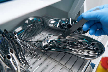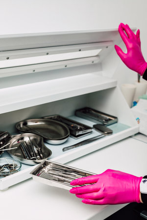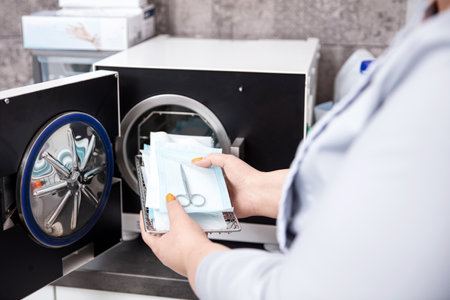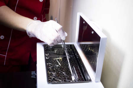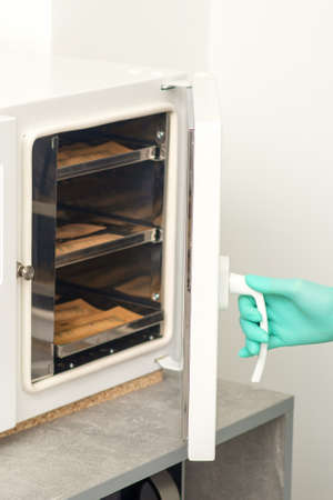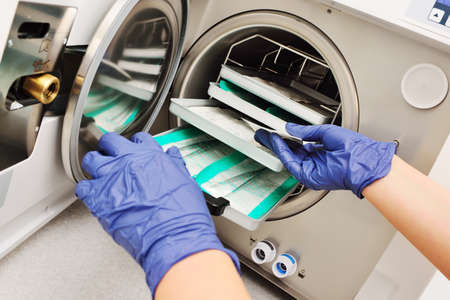 Dentist assistant's hands get out sterilizing medical instruments from autoclave. Selective focus