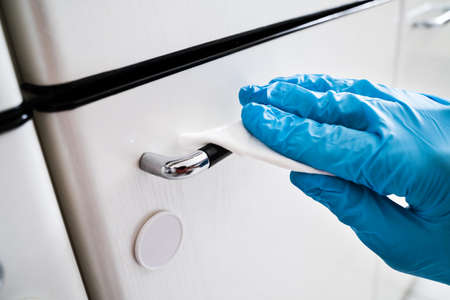 Man Wiping Cabinet Handle In The Kitchen With Sanitizer Against Virus Infection