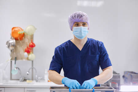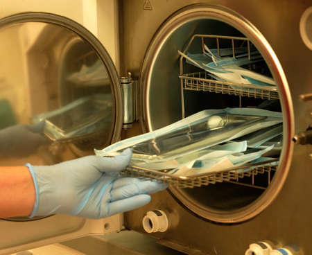 Dentist loading steel dental instruments sealed in separate airtight packaging in a steam autoclave for sterilization