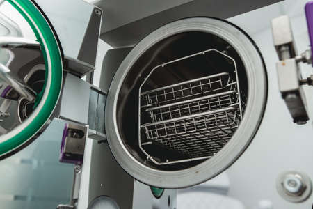 Steam sterilizer autoclave with the door open in a medical laboratory