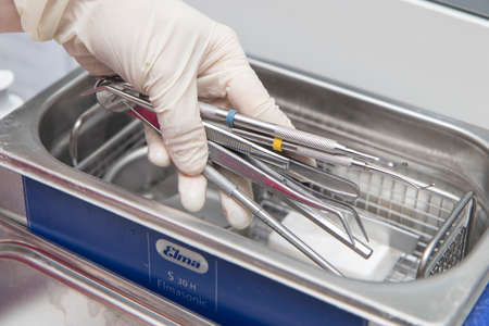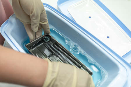 Hands are cleaning medical instruments. Disinfection of a dental instrument. Dental office