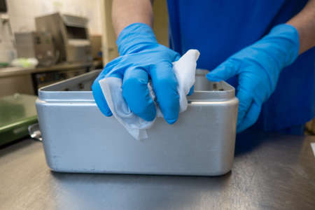 a member of an operating department cleans instrument containers with a cleaning cloth