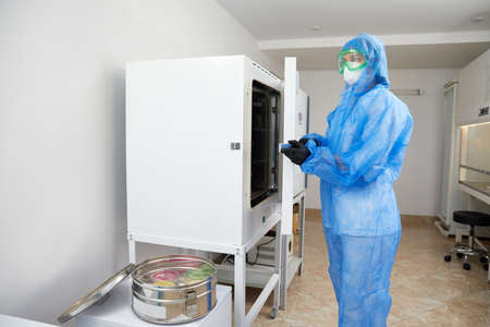 Laboratory worker operating Modern laboratory autoclave sterilizer