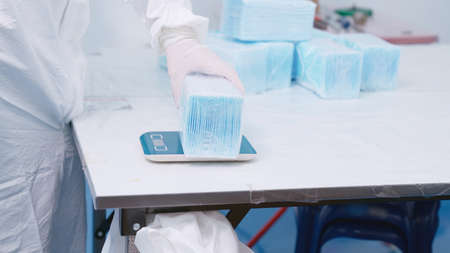 Face mask production line in modern factory . Concept of covid-19 coronavirus 2019 provention .
