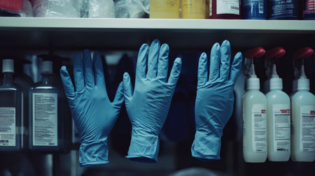 A close-up view of three pairs of blue disposable gloves arranged neatly on a shelf filled with various cleaning supplies, showcasing organization and hygiene in a workspace.
