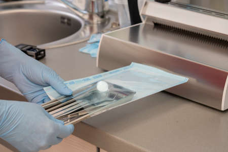 Close up dentist assistant's hands holding packaged with vacuum packing machine medical instruments ready for sterilizing in autoclave. Selective focus, space for text. Health care concept.