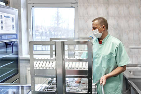 Sterilizing medical instruments in autoclave. selective focus. Dentist assistant's get out sterilizing medical instruments from autoclave. sterile dental tools