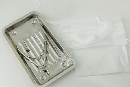 Ear, Nose and Throat doctor instruments. Still life of tools on metal tray.