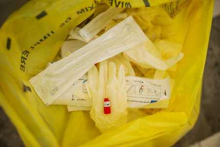 Bucharest, Romania - March 13, 2020: Details with medical vials holding coronavirus tests.