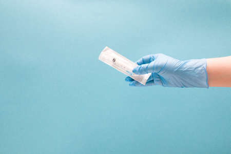 female hand in a blue disposable medical glove holds a disposable syringe in a package, blue background copy space