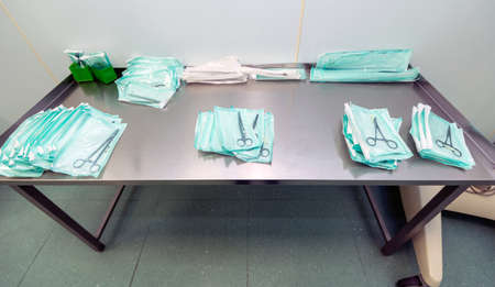 surgical equipment at surgery desk. Medical tools such scissors, scalpel.
