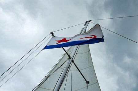 Ulyanovsk, Russia - July 27, 2019. Flag of the Russian Navy against the sky with clouds and a triangular sail
