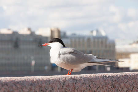 Beautiful polar Tern against a background of beautiful blue sky with cumulus clouds.