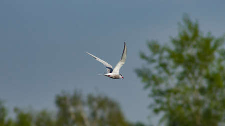 Turn with spread wings in flight. front view. Blue sky and sea waves in the background. Adult common tern in flight. Sterna hirundo. Natural habitat, summer season. Ladoga Lake
