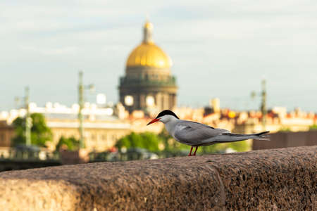 St. Petersburg, Russia - June, 17, 2020: Cegrava (Hydroprogne caspia) on the granite parapet of the Neva against the background of St. Isaac's Cathedral.