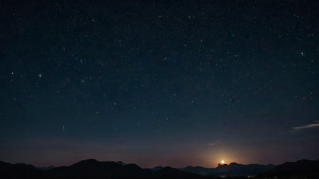 A stunning view of a vibrant sunset sky features a shooting star streaking across the twilight horizon. This captivating mountain landscape showcases the beauty of nature as stars twinkle above, creating a peaceful and serene atmosphere perfect for inspiring adventure and relaxation.