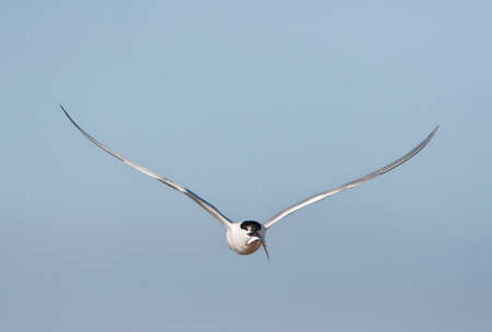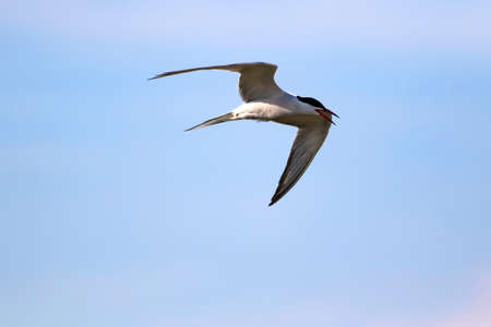 Turn with spread wings in flight. front view. Blue sky and sea waves in the background. Adult common tern in flight. Sterna hirundo. Natural habitat, summer season. Ladoga Lake