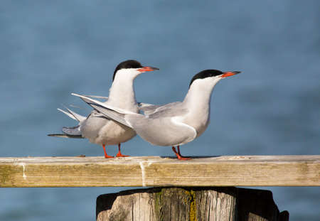 Two Terns on a wooden plank on the waterfront