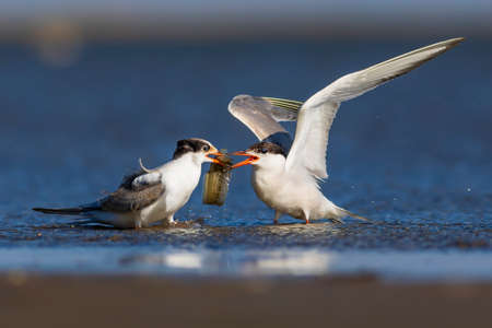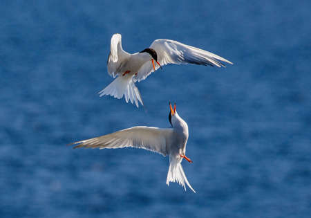 Common Terns interacting in flight. Adult common terns in flight in sunset light on the blue sea background. Scientific name: Sterna hirundo. Ladoga Lake. Russia