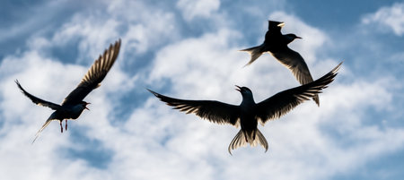 Showdown in the sky. Common Terns interacting in flight. Adult common terns in flight in sunset light on the sky background. Scientific name: Sterna hirundo.