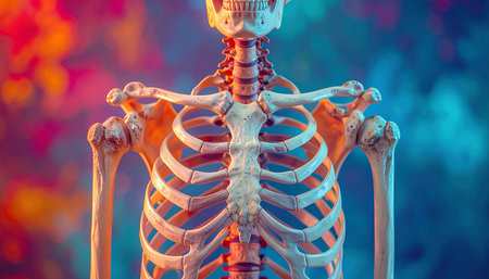 A detailed close-up of a human torso skeleton against a vibrant, abstract, and colorful background with dramatic lighting.