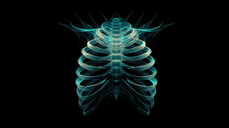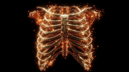 Stunning digital illustration of a rib cage structure, featuring glowing particles that enhance the visual appeal, perfect for use in medical illustrations and creative projects.