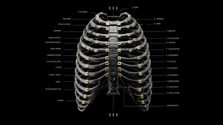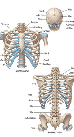 Explore a detailed anatomical illustration of the human rib cage, showcasing essential features and rib counts, perfect for educational and medical resources.