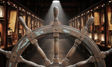 Weathered wooden ship wheel with ten spokes, prominently displayed in a dimly lit maritime museum exhibit, surrounded by historical artifacts and lanterns.