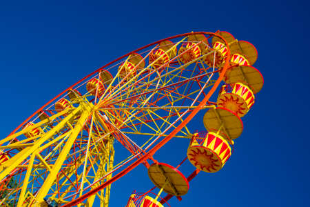 Ferris wheel carousel with colorful cabs against the blue sky in the attraction park.