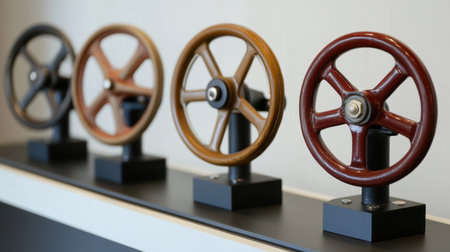 Explore a captivating display of vintage industrial control wheels, blending nostalgia with modern design in a unique interior setting. Ideal for decor inspiration.