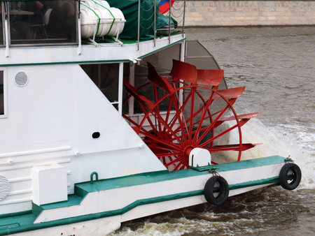 The pushing wheel of an old river ship is in motion. Red.
