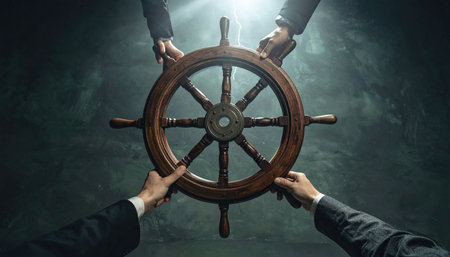 In a dramatic display of unity, multiple hands in business attire grasp a vintage ship's wheel, collectively steering a course.