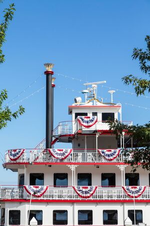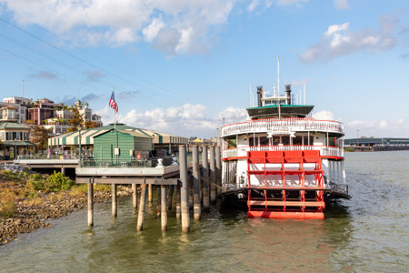 New Orleans, USA - October 24, 2023: Steamboat Natchez before its daily cruise up the Mississippi River. The Natchez is the last authentic steamboat in operation on the river.