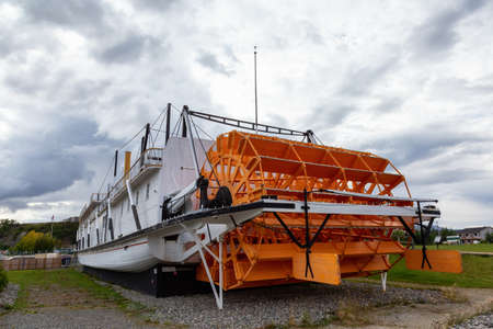 Whitehorse, Yukon, Canada - August 23, 2020: Historic Boat Memorial, Klondike, in the public city park during a cloudy summer day.