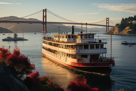 A ferry boat gliding across calm waters, with passengers enjoying the view from the deck.. --ar 16:7 --v 6.1 Job ID: 5576016b-7efd-4ed7-9539-652556d18a82