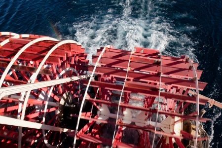 Red paddle wheel on a boat churning the water