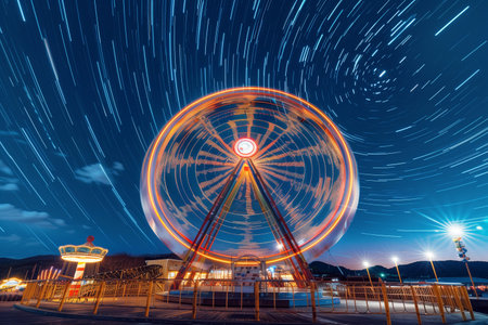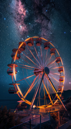 A Ferris wheel stands tall against a backdrop of the Milky Way, illuminated by bright lights.